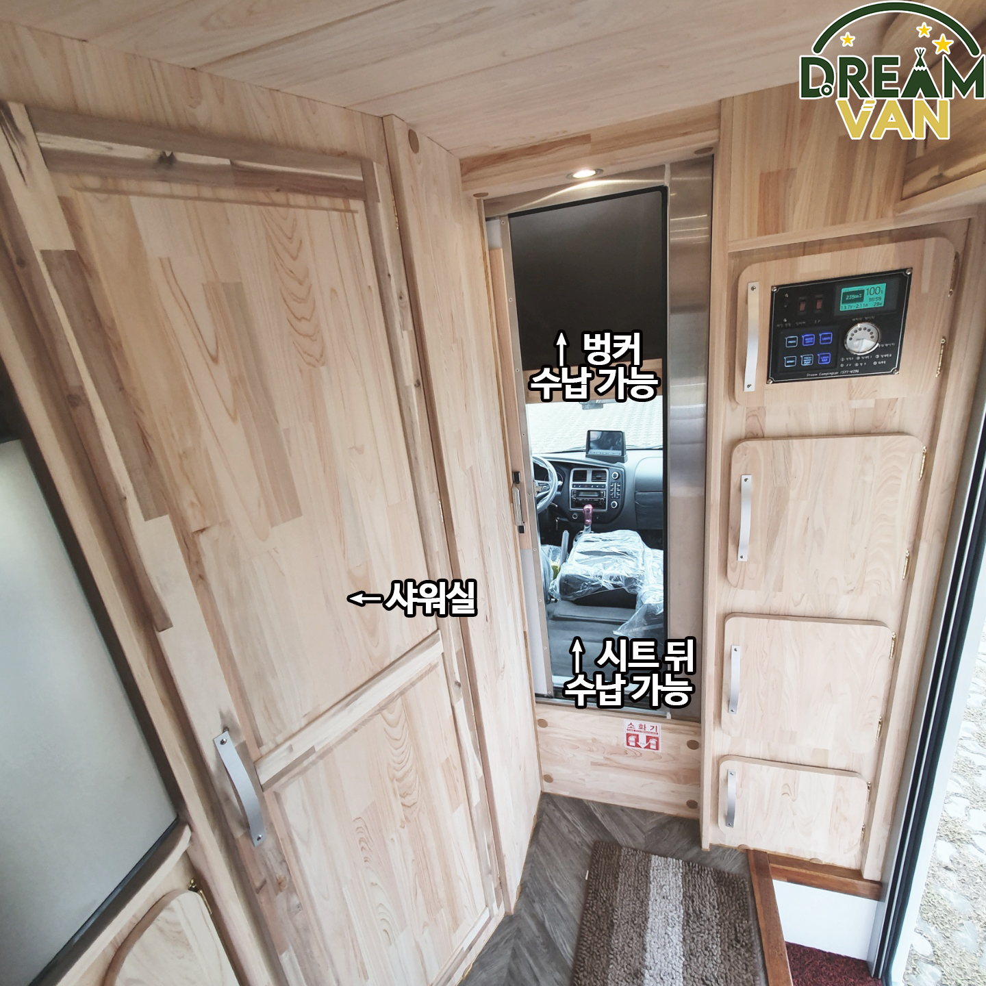 차 뒤쪽에 있는 문이 샤워실 한쪽 벽이 되는 구조입니다.